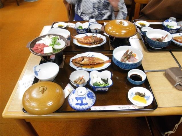 Dîner au minshuku. C'est toujours très esthétique, des petites portions servies dans un tas de coupelles. Une fois, Colette a compté 13 coupelles différentes par personne ! Le bol de riz, la soupe miso, du poisson, du tofu, des légumes en sauce acidulée, deux tranches de fruits, des algues, des crevettes, etc. Parfois aussi sur le plateau : un petit réchaud à bougie sur lequel cuit un bouillon.