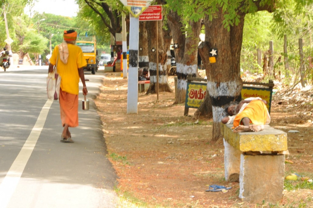 Comme d'autres pèlerins, dont de nombreux sadhus, nous faisons le tour du mont sacré Arunachala. 14 kilomètres, 38°. Mais il y régulièrement de l'ombre, et le rythme est lent.