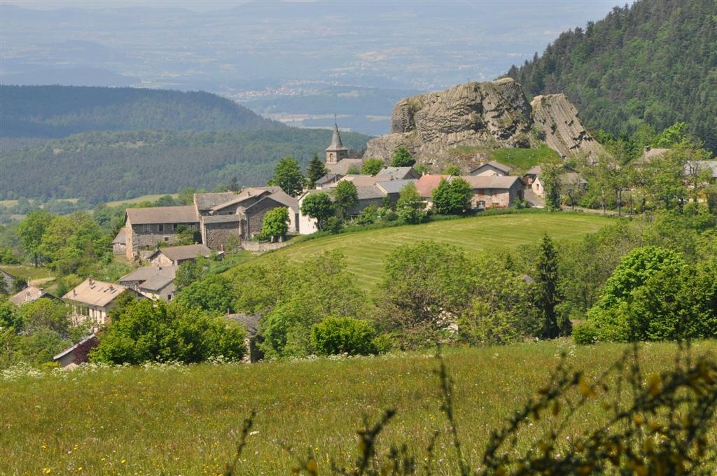 Le village de Queyrières et ses orgues volcaniques.