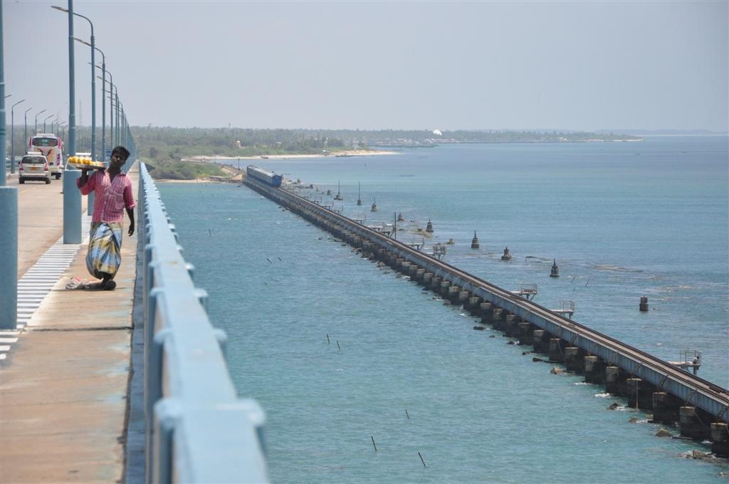 Rameswaram est reliée au continent par un énorme viaduc routier et une antique voie ferrée sur pilotis.