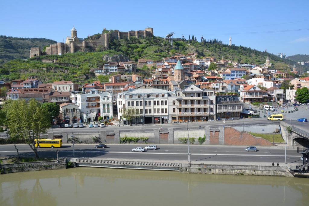 Arrivée à Tbilissi, capitale actuelle de la Géorgie et capitale de toute la région du Caucase depuis le 5ème siècle. La partie ancienne se repère aux toits de tuiles rouges et est concentrée sur la rive droite de la rivière Kura.