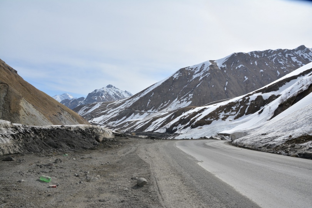 Changement de décor : la route vers le nord grimpe rapidement dans les montagnes du Grand Caucase (col de Jvari, 2400 m). On est sur la "route militaire", construite par les Russes au 19ème siècle.