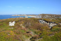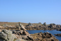 Sous le ciel bleu, départ pour le sentier côtier qui fait le tour de la corne nord-ouest de l'île. Le phare de Creac'h balise l'itinéraire. |  |  Aujourd'hui, l'Ile de Keller est bien plus visible. |  |