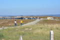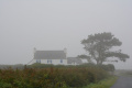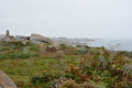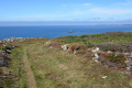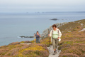Parfois un ou deux mini-bus déversent un lot de touristes ; mais la plupart du temps, en-dehors des chemins carrossables, nous sommes seuls ou presque. |  |  Lendemain ; la marche se déroule toute la journée dans la brume et un petit crachin. |  Circuit prévu : la côte Nord-Est, de Corn Héré jusqu'au phare du Stiff. Et retour, bien entendu. |