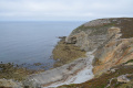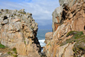 Sur le plateau s'étend une lande basse et épineuse d'ajoncs et de bruyères. |  On domine la mer sur plusieurs dizaines de mètres, le sentier peut être dangereux (éboulements). |  Une petite anse : Penn ar Ru Meur. |  |