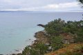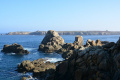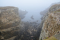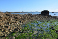 Deux poules faisanes nous indiquent le chemin vers la côte. On voit aussi des lapins gambadant dans les champs. |  A marée basse, la mer découvre des anses rocheuses profondes et escarpées. |  |  En face l'Ile de Keller a du mal à sortir de la brume. |