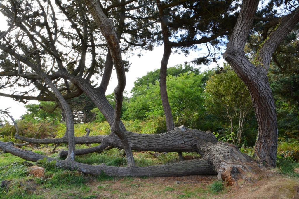 Les arbres, beaucoup de pins, sont souvent pliés.