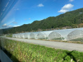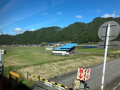 |  Lendemain, lundi 20 octobre, 2 heures de train avec un changement de ligne, pour rejoindre Kanazawa. |  La voie ferrée suit des fonds de vallée, chaque bout de terrain est occupé : riz, légumes, arbres fruitiers. |  Peu à peu on sort des montagnes. Et on finit par arriver à la grande gare de Kanazawa. |
