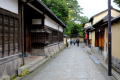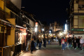 |  Nous redescendons par un large sentier, alors que la nuit tombe. |  Sur le chemin de la gare Kawaramachi (ligne vers Arashiyama-Hankyu), traversée du vieux quartier Gion. |  Nombreuses ruelles, vieilles maisons en bois. |