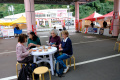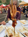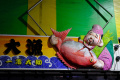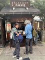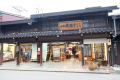 Dernier jour à Takayama. On se promène dans les vieux quartiers ; vers un hall où sont exposés les chars utilisés lors de festivals. |  |  Dans les rues, des kiosques permettent d'apaiser une petite faim. Ici, on vend des dango, brochettes de boulettes de farine de riz gluant. |  Une boutique de sashiko (broderie dite grain de riz). |