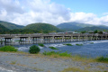 Il est situé en bordure de l'agglomération, au pied des Montagnes de l'Ouest. |  Lundi matin, nous sommes en forme pour faire les touristes. Pour rejoindre la partie centrale d'Arashiyama, on passe d'abord un petit pont, |  Puis le grand pont qui franchit la rivière Katsura. On est tout proche de deux lieux incontournables de Kyoto, le temple Tenryü-ji et la bambouseraie. |  La bambouseraie, des petits chemins dans une vaste forêt de bambous. C'est beau, sauf que, il y a au moins autant de touristes que de bambous... |