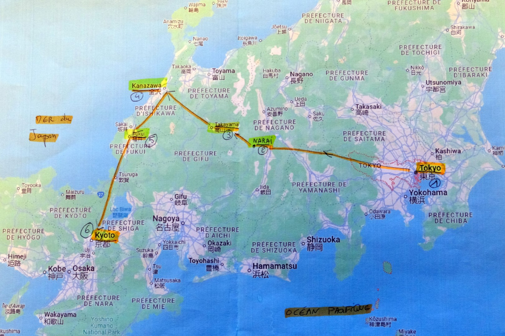 Idée de base : en 3 semaines, traverser d'est en ouest (environ 300 kilomètres) l'île principale Honshu, en découvrant les paysages et les cités des Alpes Japonaises, arriver sur la côte ouest face à la Mer du Japon, pour finir à Kyoto, découverte pour certains, redécouverte pour d'autres.