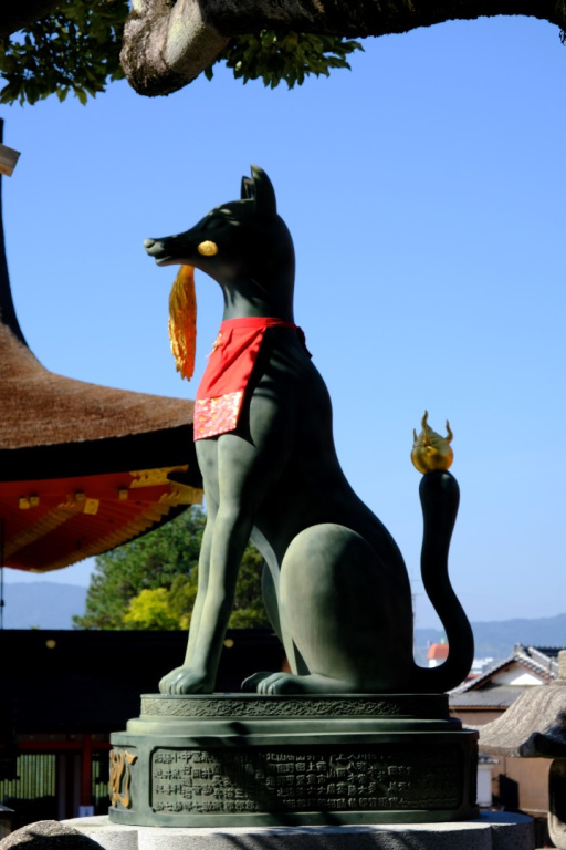 Fushimi-Inari est un sanctuaire datant du VIIIème siècle, dédié à Inari, divinité des récoltes. Son emblème est un renard qui porte dans sa gueule la clé des greniers à riz.