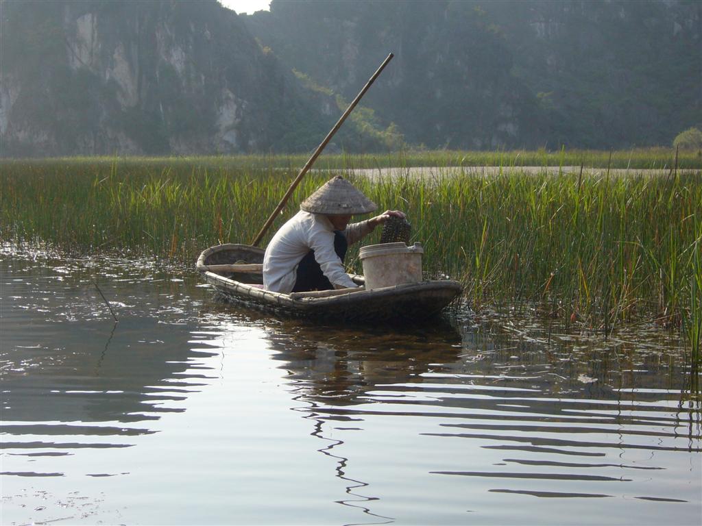 Le pêcheur vient relever ses nasses et y remettre un appât : des escargots écrasés.