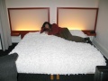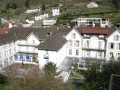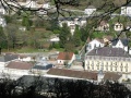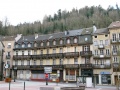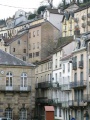 Admirez le travail du bois des balcons ! |  La petite ville se loge le long d'un vallon ; les maisons s'empilent sur les versants. |  L'entrée d'un des établissements thermaux. Dans celui-ci il y a aussi une partie non médicale : bassins, jacuzzi, hamam, etc. Dans un dédale souterrain de couloirs taillés dans la roche, sur des sources d'eau à 85°. Autant dire qu'il fait très chaud. Certaines parties datent des romains, qui exploitaient déjà ces sources. |  Chambre dans l'Impérial palace. Le couvre lit comme les tapis flokatis à la mode en 1970. On sent que le mobilier a été fabriqué par le menuisier du coin : massif, robuste. |