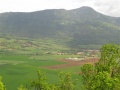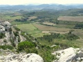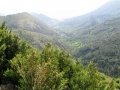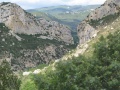 Vue sur la vallée de Fenouillèdes. On peut apercevoir Caudiès. Et en face : le massif où nous allons, vers Aigues-Bonnes. |  La vallée d'Aigue-Bonnes ; notre gite est tout dans le fond, la petite tache blanche vers la droite. |  Sixième jour : on commence par la visite du château de Puilaurens. Encore une fois, il faut grimper sec pour atteindre les ruines. |  L'entrée du château, bien conservé. |