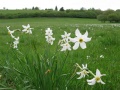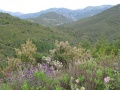 Second jour, de Durban vers Tuchan. Quel est ce château ? On en a tellement vus, durant ces deux semaines. D'après l'heure, le château de Durban. |  Changement de paysage : on est maintenant dans des chaînons calcaires, la végétation est très belle, tout est en fleurs. Mais nos pieds souffrent des nombreux petits raidillons, bien pentus. |  Arrivée en vue du château d'Aguilar, dominant les vignes fraîchement taillées. On pense à toutes ces bouteilles de Corbières, qui vont sortir de là. |  Vue sur le massif du Canigou. On dit à Béziers que quand on voit le Canigou, il va pleuvoir dans les prochains jours. Vrai. |