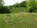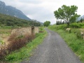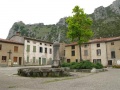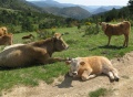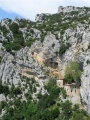 Et même des alpages ; les vaches sont principalement de race gasconne (couleur grise). |  Approche des gorges de Galamus. Même les roches font du mimétisme avec les châteaux. |  Dans les gorges de Galamus, l'ermitage Saint Antoine. Coin touristique, avec un parking pour voitures et bus. On en profite pour se payer une bonne glace ! |  Les gorges de Galamus : belle entaille de quelques centaines de mètres de profondeur dans un massif calcaire. Nous prenons la route très étroite pour les traverser. |