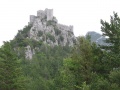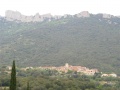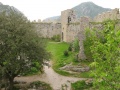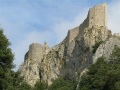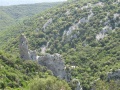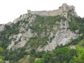 Vue sur le village de Duilhac, surmonté par l'impressionnante forteresse de Peyrepertuse. |  Le quatrième jour (de Duilhac à Camps sur Agly) commence par la visite de Peyrepertuse, tôt le matin. Le château est très éffilé, perché sur un promontoire qui le fait ressembler à la proue d'un bateau. |  Vue de la première enceinte. Il y en a deux autres concentriques. |  On rentre dans le massif des Hautes Corbières. De plus en plus de forêts. |