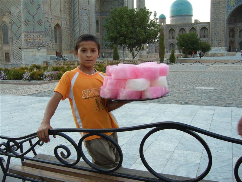 Le soir, place du Régistan à Samarkande. On lui a acheté 2 barbes à papa, pour 1000 soum (je crois). C'est 1/2 euro.