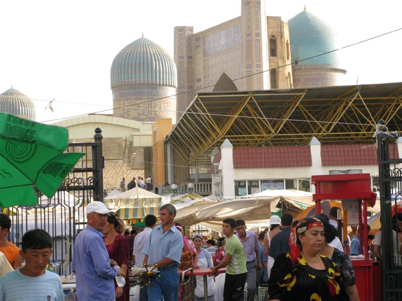 Toujours à Samarkande, la mosquée de Bibi Khanoum, qui veut dire : première femme. De Tamerlan. Lequel construisit cette mosquée en 1400, avec le butin qu'il ramena d'Inde après avoir saccagé Delhi. Elle est située à côté du bazar, qui se tenait déjà au même endroit il y a des siècles.
