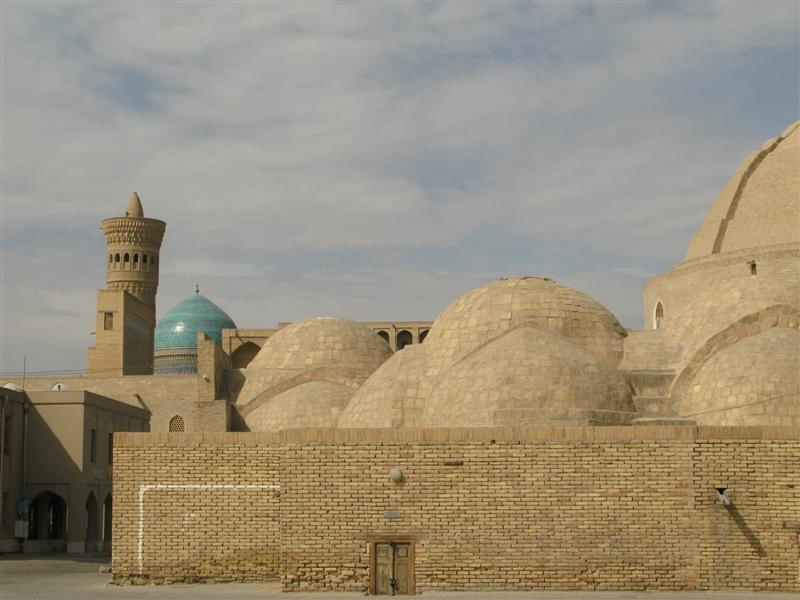 Les dômes de la mosquée Po-i-Kalon, et le fameux minaret Kalon. 48 m de haut, un escalier en colimaçon où il fait noir comme une nuit sans lune, et un tas d'histoires à son sujet... Il a été construit vers 1070 et depuis, il tient le coup.