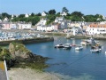 Après avoir tourné autour de la Pointe du Skeul, point le plus au sud, on repart vers le nord-est en direction de la plage de Port Blanc. C'est ici que le chemin part vers Locmaria, dernière des quatre communes de l'île. Dernière nuit de la randonnée. Et miracle : un restaurant qui sert des poissons. |  Ah quand même, le temps breton. Une petite pluie très fine, un air un peu plus frais. |  Locmaria : un joli petit village de marins. |  Port Maria, sous la brume. |