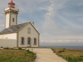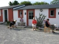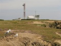 On a un peu l'impression d'être surveillé. |  On dépasse Sauzon pour aller voir la Pointe des Poulains, extrémité nord-ouest de l'île. Le paysage devient un peu plus sauvage : falaises noires plus hautes, houle plus forte. Et encore, il fait beau aujourd'hui. |  Le phare de la pointe des Poulains. A cet endroit se trouve aussi une résidence qu'avait achetée Sarah Bernard. Il y a un musée, qu'on ne visitera pas. |  Et le soir, repos au gîte (enlever les godasses de marche fumantes, se laver, se masser les mollets). C'est l'heure où apparaît l'Elastoplast. |