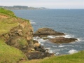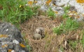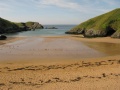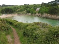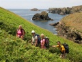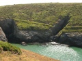 Vers la grotte de l'Apothicairerie. La mer entame la roche et creuse de nombreuses grottes, fissures, abers, et découpe la côte en dentelle. |  C'était probablement la période de couvaison et d'élevage des petits goélands. Nous verrons régulièrement les oiseaux couver, ou garder des petites boules en duvet tacheté. |  Le plateau et sa végétation adaptée aux vents humides, froids, salés. |  L'une des nombreuses criques : Port de Kerlédan, Port Skeul, Port de Donnant... |