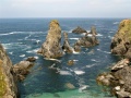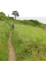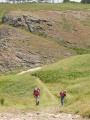Matinée du second jour. Nous sommes maintenant sur la façade ouest de l'île, en train de descendre plein sud (comme des vrais petits matelots, nous avons notre compas devant les yeux). Le sentier longe le bord de l'océan : sur la falaise, descente vers les criques (les ports comme ils disent), un peu de plage, remontée sur la falaise d'en face. |  C'est bien plus élevé de ce coté de l'île, se plaignent nos mollets. Mais bien plus sauvage aussi, plus beau. Toute la journée, nous respirons les embruns du large. |  Sur le plateau, fini les vaches ; c'est pelé, ras. Des herbes dures, des buissons. |  La côte est parsemée d'îlots rocheux. |