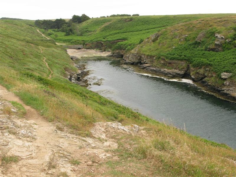 Matinée du second jour. Nous sommes maintenant sur la façade ouest de l'île, en train de descendre plein sud (comme des vrais petits matelots, nous avons notre compas devant les yeux). Le sentier longe le bord de l'océan : sur la falaise, descente vers les criques (les ports comme ils disent), un peu de plage, remontée sur la falaise d'en face.