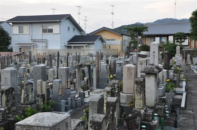 Depuis la fenêtre de la cuisine, un petit cimetière. On voit la maison louée dans le fond, à gauche.