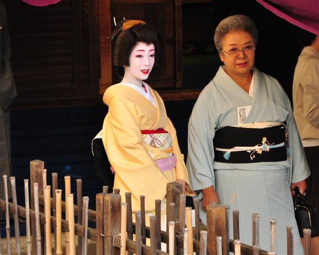 Soir dans le quartier de Gion à Kyoto. Il y a semble-t-il une réception dans un bâtiment ; femmes en habits traditionnels, et Geishas.